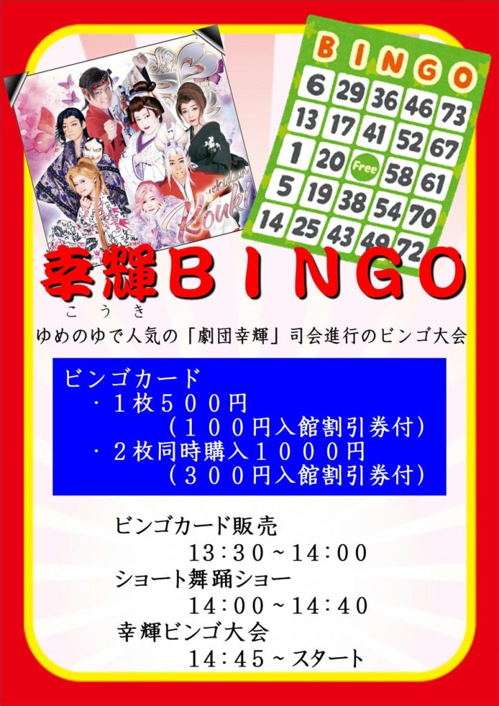 2025.08.20 イベント情報 お知らせ 【復活!ビンゴ大会】 平素より金沢ゆめのゆを ご利用頂きまして 誠にありがとうございます。 令和7年8月から 『ビンゴ大会』が復活! ★★★★★★ 8月22日(金) 9月19日(金)が決定しております。 ★★★★★★ 復活ビンゴ大会は ゆめのゆで人気の大衆演劇劇団の 『劇団幸輝』司会進行です。 ★★★★★★ 13:30からビンゴカード販売 14:00からショートプログラムの舞踊ショー 概ね 14:45からビンゴ大会 を予定しております。